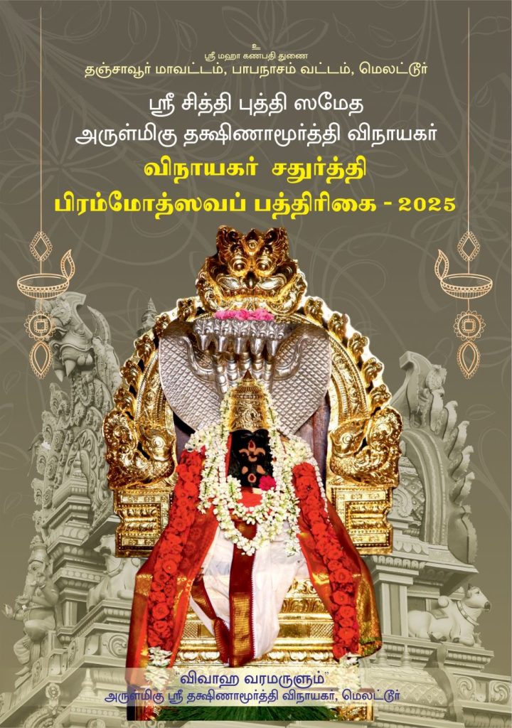 ‘Sri Gananatha Trust’, Melattur is so pleased to invite you for the ‘’Brahmotsavam’’ of Sree Siddhi Buddhi Sametha Arulmigu Dakshinamurthy Vinayakar (Vivaha Varamarulum Vinayakar) Temple, Melattur in connection with ‘Vinayaka Chathurthi’ which is scheduled to start from 17/08/2025 and ends on 27/08/2025