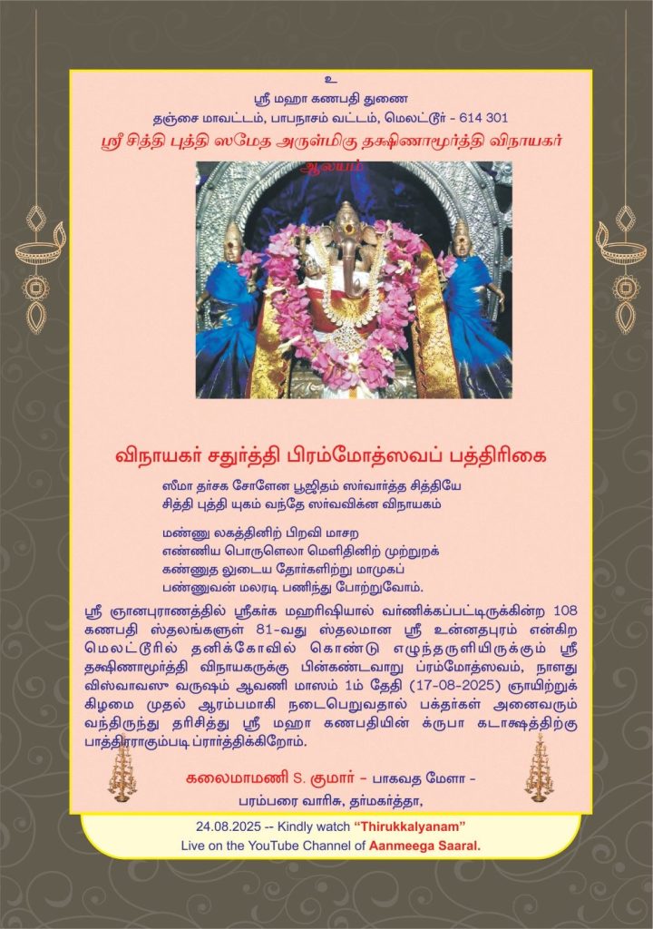 You are aware that this Temple is very famous in many ways (with all your support only since 2012) and the Unique Event of this Temple is the ‘’Thirukkalyanam’ which is a very rare one among Vinayakar Temples in the South. On 24/08/25, the “Thirukkalyanam of Dakshinamurthy Vinayakar with Ambal Sree Siddhi Buddhi” will take place from 8.15am. ( Watch it Live on Temple’s YouTube Channel & Aanmeega Saral YouTube Channel)