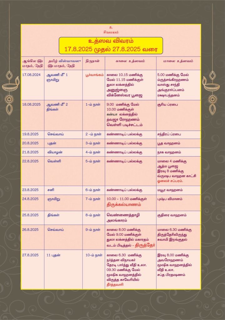 people / devotees come from all over India to witness / worship and to seek the blessings of Lord Vinayagar. This year, ‘Thirukkalyanam’ will be on 24th August-2025