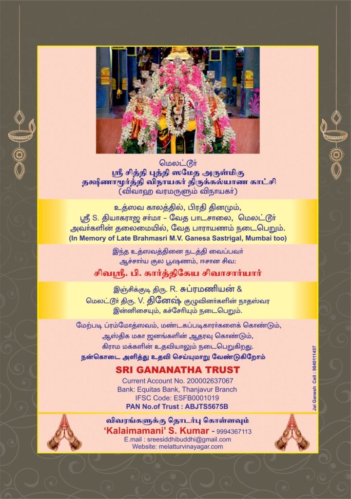 With this advanced information, I am sure you can plan to visit Melattur not only to witness this Special Event but also to seek the blessings of Lord Dakshinamurthy Vinayakar. Whoever is interested in doing ‘’Prarthanai Marriage Abhishekham’’, kindly inform us in advance.